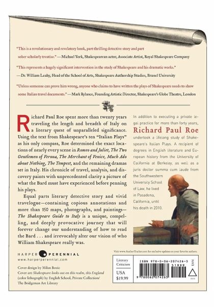 Richard Paul Roe spent more than twenty years traveling the length and breadth of Italy on a literary quest of unparalleled significance. Using the text from Shakespeare’s ten “Italian Plays” as his only compass, Roe determined the exact locations of nearly every scene in Romeo and Juliet, The Two Gentlemen of Verona, The Merchant of Venice, Much Ado about Nothing, The Tempest, and the remaining dramas set in Italy. His chronicle of travel, analysis, and discovery paints with unprecedented clarity a picture of what the Bard must have experienced before penning his plays. Equal parts literary detective story and vivid travelogue—containing copious annotations and more than 150 maps, photographs, and paintings—The Shakespeare Guide to Italy is a unique, compelling, and deeply provocative journey that will forever change our understanding of how to read the Bard . . . and irrevocably alter our vision of who William Shakespeare really was.