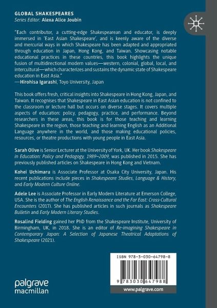 Sarah Olive is Senior Lecturer at the University of York, UK. Her book Shakespeare in Education: Policy and Pedagogy, 1989-2009, was published in 2015. She has previously published articles on Shakespeare in Hong Kong and Vietnam. Uchimaru Kohei is Associate Professor at Osaka City University, Japan. His recent publications include pieces in Shakespeare Studies, Language & History, and Early Modern Culture Online . Adele Lee is Associate Professor in Early Modern Literature at Emerson College, USA. She is the author of The English Renaissance and the Far East: Cross-Cultural Encounters (2017). She has published articles in such journals as Shakespeare Bulletin and Early Modern Literary Studies. Rosalind Fielding gained her PhD from the Shakespeare Institute, University of Birmingham, UK, in 2018. She is an editor of Re-imagining Shakespeare in Contemporary Japan: A Selection of Japanese Theatrical Adaptations of Shakespeare (2021).