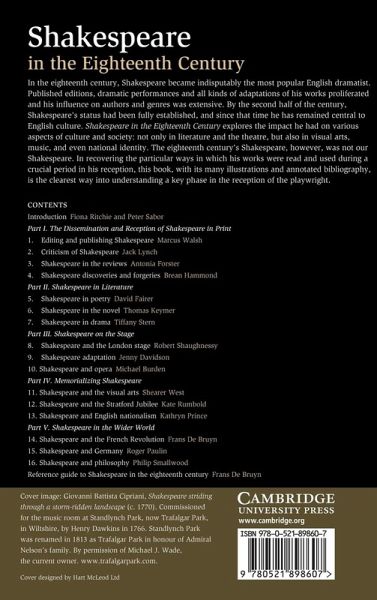 In the eighteenth century, Shakespeare became indisputably the most popular English dramatist. Published editions, dramatic performances and all kinds of adaptations of his works proliferated and his influence on authors and genres was extensive. By the second half of the century Shakespeare's status had been fully established, and since that time he has remained central to English culture. Shakespeare in the Eighteenth Century explores the impact he had on various aspects of culture and society: not only in literature and the theatre, but also in visual arts, music and even national identity. The eighteenth century's Shakespeare, however, was not our Shakespeare. In recovering the particular ways in which his works were read and used during this crucial period in his reception, this book, with its many illustrations and annotated bibliography, is the clearest way into understanding this key phase in the reception of the playwright.