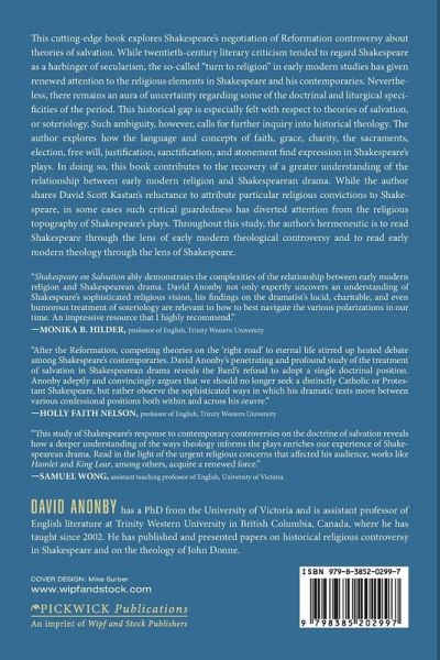 This cutting-edge book explores Shakespeare's negotiation of Reformation controversy about theories of salvation. While twentieth century literary criticism tended to regard Shakespeare as a harbinger of secularism, the so-called ""turn to religion"" in early modern studies has given renewed attention to the religious elements in Shakespeare and his contemporaries. Nevertheless, there remains an aura of uncertainty regarding some of the doctrinal and liturgical specificities of the period. This historical gap is especially felt with respect to theories of salvation, or soteriology. Such ambiguity, however, calls for further inquiry into historical theology. The author explores how the language and concepts of faith, grace, charity, the sacraments, election, free will, justification, sanctification, and atonement find expression in Shakespeare's plays. In doing so, this book contributes to the recovery of a greater understanding of the relationship between early modern religion and Shakespearean drama. While the author shares David Scott Kastan's reluctance to attribute particular religious convictions to Shakespeare, in some cases such critical guardedness has diverted attention from the religious topography of Shakespeare's plays. Throughout this study, the author's hermeneutic is to read Shakespeare through the lens of early modern theological controversy and to read early modern theology through the lens of Shakespeare.