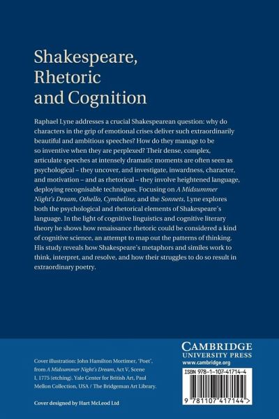 Raphael Lyne addresses a crucial Shakespearean question: why do characters in the grip of emotional crises deliver such extraordinarily beautiful and ambitious speeches? How do they manage to be so inventive when they are perplexed? Their dense, complex, articulate speeches at intensely dramatic moments are often seen as psychological - they uncover and investigate inwardness, character and motivation - and as rhetorical - they involve heightened language, deploying recognisable techniques. Focusing on A Midsummer Night's Dream, Othello, Cymbeline and the Sonnets, Lyne explores both the psychological and rhetorical elements of Shakespeare's language. In the light of cognitive linguistics and cognitive literary theory he shows how Renaissance rhetoric could be considered a kind of cognitive science, an attempt to map out the patterns of thinking. His study reveals how Shakespeare's metaphors and similes work to think, interpret and resolve, and how their struggle to do so results in extraordinary poetry.