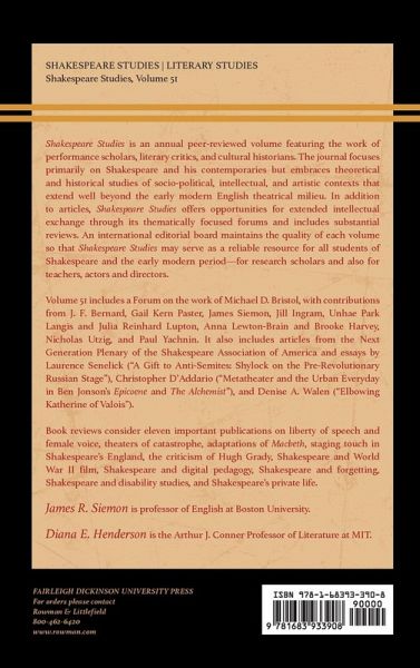 Shakespeare Studies is an annual peer-reviewed volume featuring the work of performance scholars, literary critics and cultural historians. The journal focuses primarily on Shakespeare and his contemporaries, but embraces theoretical and historical studies of socio-political, intellectual and artistic contexts that extend well beyond the early modern English theatrical milieu. In addition to articles, Shakespeare Studies offers opportunities for extended intellectual exchange through its thematically-focused forums, and includes substantial reviews. An international Editorial Board maintains the quality of each volume so that Shakespeare Studies may serve as a reliable resource for all students of Shakespeare and the early modern period – for research scholars and also for teachers, actors and directors. Volume 51 includes a Forum on the work of Michael D Bristol, with contributions from J. F. Bernard, Gail Kern Paster, James Siemon, Jill Ingram, Unhae Park Langis and Julia Reinhard Lupton, Anna Lewton-Brain and Brooke Harvey, Nicholas Utzig, and Paul Yachnin. Volume 51 includes articles from the Next Generation Plenary of the Shakespeare Association of America and essays by Laurence Senelick ("A Gift to Anti-Semites: Shylock on the Pre-Revolutionary Russian Stage"), Christopher D'Addario ("Metatheater and the Urban Everyday in Ben Jonson's Epicoene and The Alchemist"), and Denise A. Walen ("Elbowing Katherine of Valois"). Book reviews consider eleven important publications on liberty of speech and female voice; theaters of catastrophe; adaptations of Macbeth; staging touch in Shakespeare's England; the criticism of Hugh Grady; Shakespeare and World War II film; Shakespeare and digital pedagogy; Shakespeare and forgetting; Shakespeare and disability studies, and Shakespeare's private life.