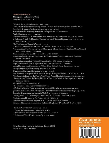 Shakespeare Survey is a yearbook of Shakespeare studies and productions which has published the best international scholarship in English since 1948. The theme for Volume 67 is 'Shakespeare's Collaborative Work'. The complete set of Survey volumes is also available online at http://www.cambridge.org/online/shakespearesurvey.