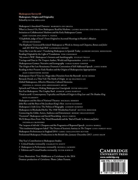 The theme for Shakespeare Survey 68 is 'Shakespeare, Origins and Originality'.