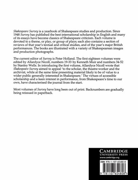 Shakespeare Survey is a yearbook of Shakespeare studies and production. Since 1948 Survey has published the best international scholarship in English and many of its essays have become classics of Shakespeare criticism. Each volume is devoted to a theme, or play, or group of plays; each also contains a section of reviews of that year's textual and critical studies, and of the year's major British performances. The books are illustrated with a variety of Shakespearean images and production photographs. The virtues of accessible scholarship and a keen interest in performance, from Shakespeare's…mehr