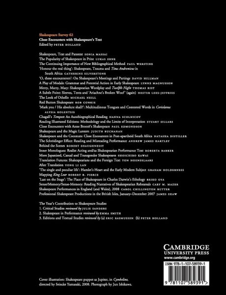 The theme for Shakespeare Survey 62 is 'Close Encounters with Shakespeare's Text'.