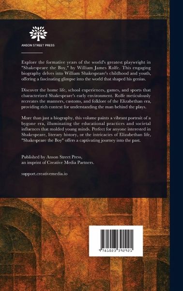 Explore the formative years of the world's greatest playwright in "Shakespeare the Boy," by William James Rolfe. This engaging biography delves into William Shakespeare's childhood and youth, offering a fascinating glimpse into the world that shaped his genius. Discover the home life, school experiences, games, and sports that characterized Shakespeare's early environment. Rolfe meticulously recreates the manners, customs, and folklore of the Elizabethan era, providing rich context for understanding the man behind the plays. More than just a biography, this volume paints a vibrant portrait of a bygone era, illuminating the educational practices and societal influences that molded young minds. Perfect for anyone interested in Shakespeare, literary history, or the intricacies of Elizabethan life, "Shakespeare the Boy" offers a captivating journey into the past. This work has been selected by scholars as being culturally important, and is part of the knowledge base of civilization as we know it. This work is in the public domain in the United States of America, and possibly other nations. Within the United States, you may freely copy and distribute this work, as no entity (individual or corporate) has a copyright on the body of the work. Scholars believe, and we concur, that this work is important enough to be preserved, reproduced, and made generally available to the public. We appreciate your support of the preservation process, and thank you for being an important part of keeping this knowledge alive and relevant.
