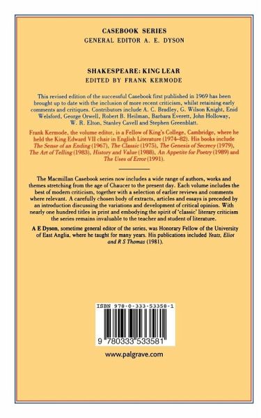 This revised edition of the successful Casebook first published in 1969, has been brought up-to-date with the inclusion of more recent criticism, whilst retaining early comments and critiques. Contributors include A.C.Bradley, A.Wilson Knight, Enid Welsford, George Orwell, Robert B.Heilman, Barbara Everett, John Holloway, W.R.Elton, Stanley Cavell and Stephen Greenblatt.
