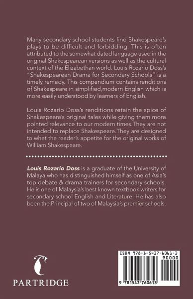Many secondary school students find Shakespeare's plays to be difficult and forbidding. This is often attributed to the somewhat dated language used in the original Shakespearean versions as well as the cultural context of the Elizabethan world. Louis Rozario Doss's "Shakespearean Drama for Secondary Schools" is a timely remedy. This compendium contains renditions of Shakespeare in simplified,modern English which is more easily understood by learners of English. Louis Rozario Doss's renditions retain the spice of Shakespeare's original tales while giving them more pointed relevance to our modern times.They are not intend to replace Shakespeare.They are designed to whet the reader's appetite for the original works of William Shakespeare.