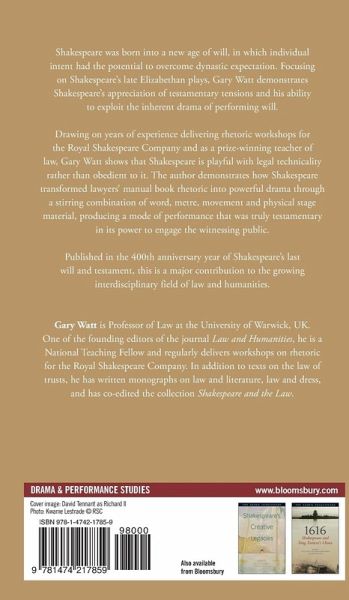Shakespeare was born into a new age of will, in which individual intent had the potential to overcome dynastic expectation. The 1540 Statute of Wills had liberated testamentary disposition of land and thus marked a turning point from hierarchical feudal tradition to horizontal free trade. Focusing on Shakespeare's late Elizabethan plays, Gary Watt demonstrates Shakespeare's appreciation of testamentary tensions and his ability to exploit the inherent drama of performing will. Drawing on years of experience delivering rhetoric workshops for the Royal Shakespeare Company and as a prize-winning teacher of law, Gary Watt shows that Shakespeare is playful with legal technicality rather than obedient to it. The author demonstrates how Shakespeare transformed lawyers' manual book rhetoric into powerful drama through a stirring combination of word, metre, movement and physical stage material, producing a mode of performance that was truly testamentary in its power to engage the witnessing public. Published on the 400th anniversary of Shakespeare's last will and testament, this is a major contribution to the growing interdisciplinary field of law and humanities.