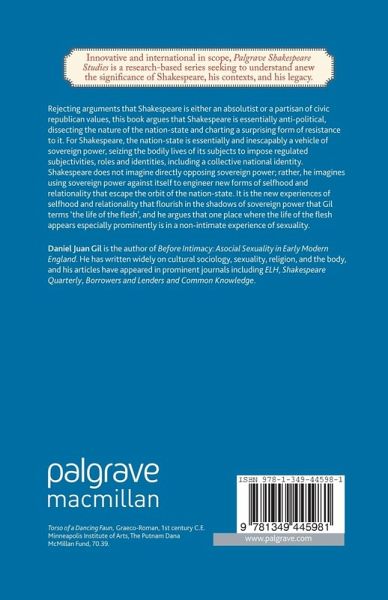 Argues that Shakespeare is anti-political, dissecting the nature of the nation-state and charting a surprising form of resistance to it, using sovereign power against itself to engineer new forms of selfhood and relationality that escape the orbit of the nation-state. It is these new experiences that the book terms 'the life of the flesh'.