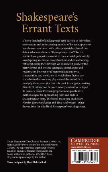If more than half of Shakespeare's texts survive in more than one version, and an increasing number of his texts appear to have been co-authored with other playwrights, how do we define what constitutes a 'Shakespearean text'? Recent studies have proposed answers to this crucial question by investigating 'memorial reconstruction' and co-authorship, yet significantly they have not yet considered properly the many formal and stylistic synergies, interchanges and reciprocities between oral/memorial and authorial composition, and the extent to which these factors are traceable in the surviving playtexts of the period. It is precisely these synergies that this book investigates, making this site of interaction between actorly and authorial input its primary focus. Petersen proposes new quantitative methodologies for approaching form and style in Shakespearean texts. The book's main case studies are Hamlet, Romeo and Juliet and Titus Andronicus - plays drawn from the middle of Shakespeare's working career.