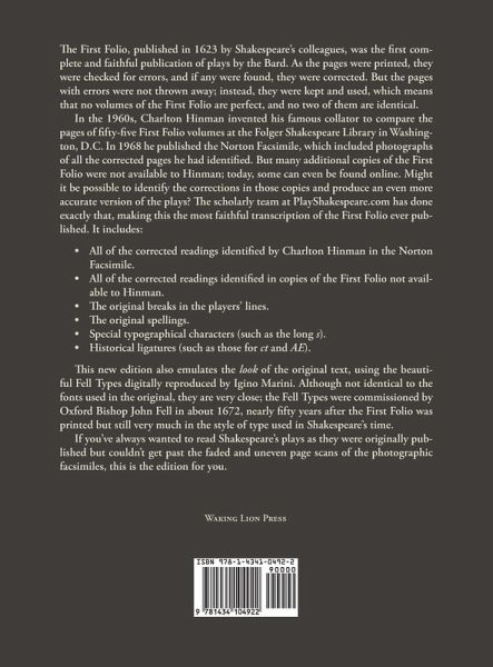 The First Folio, published in 1623 by Shakespeare's colleagues, was the first complete and faithful publication of plays by the Bard. As the pages were printed, they were checked for errors, and if any were found, they were corrected. But the pages with errors were not thrown away; instead, they were kept and used, which means that no volumes of the First Folio are perfect, and no two of them are identical. In the 1960s, Charlton Hinman invented his famous collator to compare the pages of fifty-five First Folio volumes at the Folger Shakespeare Library in Washington, D.C. In 1968 he published the Norton Facsimile, which included photographs of all the corrected pages he had identified. But many additional copies of the First Folio were not available to Hinman; today, some can even be found online. Might it be possible to identify the corrections in those copies and produce an even more accurate version of the plays? The scholarly team at PlayShakespeare.com has done exactly that, making this the most faithful transcription of the First Folio ever published. It includes: All of the corrected readings identified by Charlton Hinman in the Norton Facsimile. All of the corrected readings identified in copies of the First Folio not available to Hinman. The original breaks in the players' lines. The original spellings, down to the character. Special typographical characters (such as the long s). Historical ligatures (such as those for ct and AE). This new edition also emulates the look of the original text, using the beautiful Fell Types digitally reproduced by Igino Marini. Although not identical to the fonts used in the original, they are very close; the Fell Types were commissioned by Oxford Bishop John Fell in about 1672, nearly fifty years after the First Folio was printed but still very much in the style of type used in Shakespeare's time. If you've always wanted to read Shakespeare's plays as they were originally published but couldn't get past the faded and uneven page scans of the photographic facsimiles, this is the edition for you.