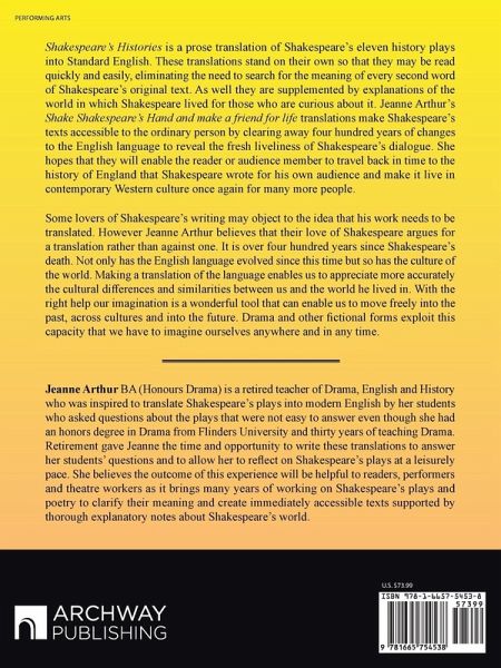 Shakespeare's Histories is a prose translation of Shakespeare's eleven history plays into Standard English. These translations stand on their own so that they may be read quickly and easily, eliminating the need to search for the meaning of every second word of Shakespeare's original text. As well they are supplemented by explanations of the world in which Shakespeare lived for those who are curious about it. Jeanne Arthur's Shake Shakespeare's Hand and make a friend for life translations make Shakespeare's texts accessible to the ordinary person by clearing away four hundred years of changes to the English language to reveal the fresh liveliness of Shakespeare's dialogue. She hopes that they will enable the reader or audience member to travel back in time to the history of England that Shakespeare wrote for his own audience and make it live in contemporary Western culture once again for many more people. Some lovers of Shakespeare's writing may object to the idea that his work needs to be translated. However Jeanne Arthur believes that their love of Shakespeare argues for a translation rather than against one. It is over four hundred years since Shakespeare's death. Not only has the English language evolved since this time but so has the culture of the world. Making a translation of the language enables us to appreciate more accurately the cultural differences and similarities between us and the world he lived in. With the right help our imagination is a wonderful tool that can enable us to move freely into the past, across cultures and into the future. Drama and other fictional forms exploit this capacity that we have to imagine ourselves anywhere and in any time.