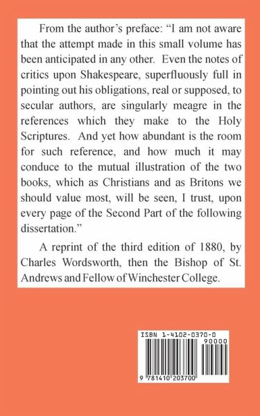 From the author's preface: "I am not aware that the attempt made in this small volume has been anticipated in any other. Even the notes of critics upon Shakespeare, superfluously full in pointing out his obligations, real or supposed, to secular authors, are singularly meagre in the references which they make to the Holy Scriptures. And yet how abundant is the room for such reference, and how much it may conduce to the mutual illustration of the two books, which as Christians and as Britons we should value most, will be seen, I trust, upon every page of the Second Part of the following dissertation." A reprint of the third edition of 1880, by Charles Wordsworth, then the Bishop of St. Andrews and Fellow of Winchester College.
