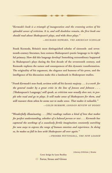 A magnum opus from our finest interpreter of The Bard The true biography of Shakespeare--and the only one we need to care about--is in his plays. Frank Kermode, Britain's most distinguished scholar of sixteenth-century and seventeenth-century literature, has been thinking about Shakespeare's plays all his life. This book is a distillation of that lifetime of thinking.The finest tragedies written in English were all composed in the first decade of the seventeenth century, and it is generally accepted that the best ones were Shakespeare's. Their language is often difficult, and it must have been hard even for contemporaries to understand. How did this language develop? How did it happen that Shakespeare's audience could appreciate Hamlet at the beginning of the decade and Coriolanus near the end of it? In this long-awaited work, Kermode argues that something extraordinary started to happen to Shakespeare's language at a date close to 1600, and he sets out to explore the nature and consequences of the dynamic transformation that followed. For it is in the magnificent, suggestive power of the poetic language itself that audiences have always found meaning and value. The originality of Kermode's argument, the elegance and humor of his prose, and the intelligence of his discussion make this a landmark in Shakespearean studies.