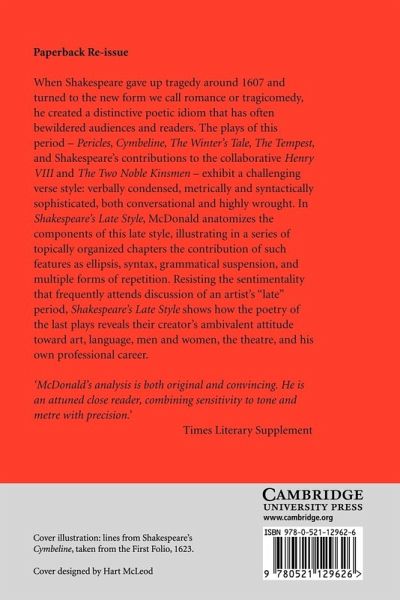 When Shakespeare gave up tragedy around 1607 and turned to the new form we call romance or tragicomedy, he created a distinctive poetic idiom that often bewildered audiences and readers. The plays of this period, Pericles, Cymbeline, The Winter's Tale, The Tempest, as well as Shakespeare's part in the collaborations with John Fletcher (Henry VIII and The Two Noble Kinsmen), exhibit a challenging verse style - verbally condensed, metrically and syntactically sophisticated, both conversational and highly wrought. In Shakespeare's Late Style, McDonald anatomizes the components of this late style, illustrating in a series of topically organized chapters the contribution of such features as ellipsis, grammatical suspension, and various forms of repetition. Resisting the sentimentality that frequently attends discussion of an artist's 'late' period, Shakespeare's Late Style shows how the poetry of the last plays reveals their creator's ambivalent attitude towards art, language, men and women, the theatre, and his own professional career.