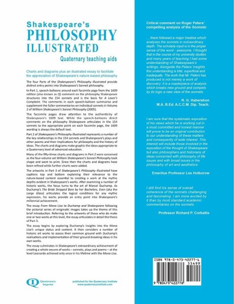 Shakespeare's Philosophy Illustrated - Quaternary Teaching Aids features a series of charts and diagrams in colour throughout its 192 pages. It is organised into four distinct Parts as teaching aids for a Quaternary level of understanding. Each Part provides a distinct entry point into Shakespeare's Sonnet philosophy. Part 1 surrounds the seventy-eight facsimile pages of the 1609 edition of Shake-speares Sonnets with succinct speech-balloon commentaries on the individual sonnets and their groupings and their relation to the companion poem A Lover's Complaint. Part 2 has fifty-three pages of charts and diagrams illustrating aspects of the Sonnet philosophy. They examine the relationship of Shakespeare's nature-based philosophy to philosophy in general along with the implications for a global demographic. Part 3 considers a number of historically enigmatic art works to demonstrate their relationship to all Shakespeare's plays and poems from the vantage of the Sonnet philosophy. Part 4 further explicates the relationships between the enigmatic images illustrated in Part 3. It features an essay on the creative depth shared by Leonardo da Vinci's one-off Mona Lisa, Marcel Duchamp's intentionally limited oeuvre and Shakespeare's entire output.