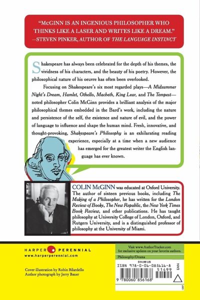 Shakespeare's plays are usually studied by literary scholars and historians and the books about him from those perspectives are legion. It is most unusual for a trained philosopher to give us his insight, as Colin McGinn does here, into six of Shakespeare's greatest plays--A Midsummer Night's Dream, Hamlet, Othello, Macbeth, King Lear, and The Tempest. In his brilliant commentary, McGinn explores Shakespeare's philosophy of life and illustrates how he was influenced, for example, by the essays of Montaigne that were translated into English while Shakespeare was writing. In addition to chapters on the great plays, there are also essays on Shakespeare and gender and his plays from the aspects of psychology, ethics, and tragedy. As McGinn says about Shakespeare, "There is not a sentimental bone in his body. He has the curiosity of a scientist, the judgement of a philosopher, and the soul of a poet." McGinn relates the ideas in the plays to the later philosophers such as David Hume and the modern commentaries of critics such as Harold Bloom. The book is an exhilarating reading experience, especially at a time when a new audience has opened up for the greatest writer in English.