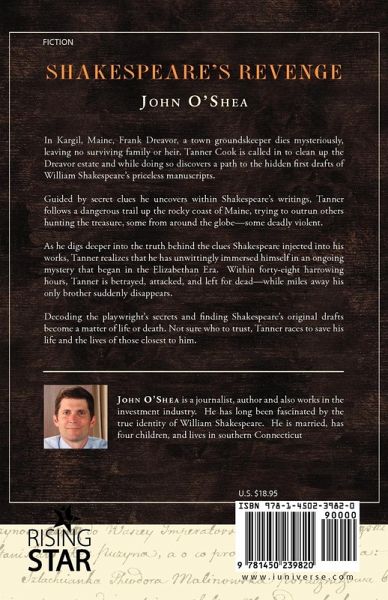 In Kargil, Maine, Frank Dreavor, a town groundskeeper dies mysteriously, leaving no surviving family or heir. Tanner Cook is called in to clean up the Dreavor estate and while doing so discovers a path to the hidden first drafts of William Shakespeare¿s priceless manuscripts. Guided by secret clues he uncovers within Shakespeare¿s writings, Tanner follows a dangerous trail up the rocky coast of Maine, trying to outrun others hunting the treasure, some from around the globe¿some deadly violent. As he digs deeper into the truth behind the clues Shakespeare injected into his works, Tanner realizes that he has unwittingly immersed himself in an ongoing mystery that began in the Elizabethan Era. Within forty-eight harrowing hours, Tanner is betrayed, attacked, and left for dead¿while miles away his only brother suddenly disappears. Decoding the playwright¿s secrets and finding Shakespeare¿s original drafts become a matter of life or death. Not sure who to trust, Tanner races to save his life and the lives of those closest to him.