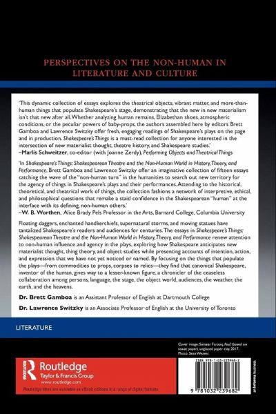 Floating daggers, enchanted handkerchiefs, supernatural storms, and moving statues have tantalized Shakespeare's readers and audiences for centuries. The essays in Shakespeare's Things: Shakespearean Theatre and the Non-Human World in History, Theory, and Performance renew attention to non-human influence and agency in the plays, exploring how Shakespeare anticipates new materialist thought, thing theory, and object studies while presenting accounts of intention, action, and expression that we have not yet noticed or named. By focusing on the things that populate the plays-from commodities to props, corpses to relics-they find that canonical Shakespeare, inventor of the human, gives way to a lesser-known figure, a chronicler of the ceaseless collaboration among persons, language, the stage, the object world, audiences, the weather, the earth, and the heavens.