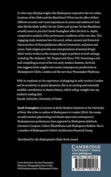 This is the first in-depth, comparative analysis of the Globe and the Blackfriars Theatres' performance conditions. Examining how the social and sensory qualities of these sites affected early modern dramatists, audiences and actors, the study also considers recent productions at Shakespeare's Globe and the new Sam Wanamaker Playhouse.