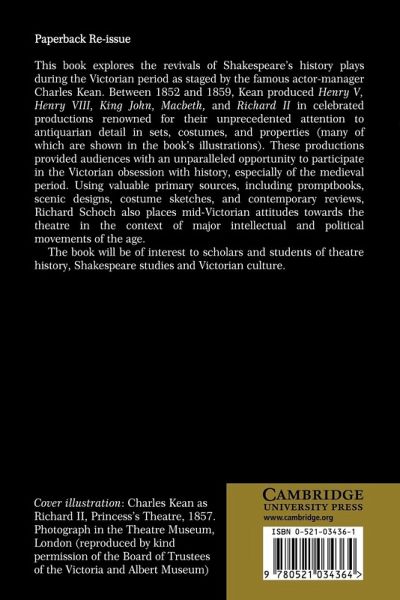 This book explores the revivals of Shakespeare's history plays during the Victorian period, as staged by the famous actor-manager Charles Kean. Between 1852 and 1859, Kean produced celebrated productions of Henry V, Henry VIII, King John, Macbeth and Richard II, renowned for their unprecendented attention to antiquarian detail in sets, costumes, and properties (many of which are shown in the book's illustrations). These productions provided audiences with an unparalleled opportunity to participate in the Victorian obsession with history, especially of the medieval period. Using valuable primary sources, including promptbooks, scenic designs, costume sketches and contemporary reviews, Richard Schoch places mid-Victorian attitudes towards the theatre in the context of major intellectual and political movements of the age. The book will be of interest to scholars and students of theatre history, Shakespeare studies and Victorian culture.