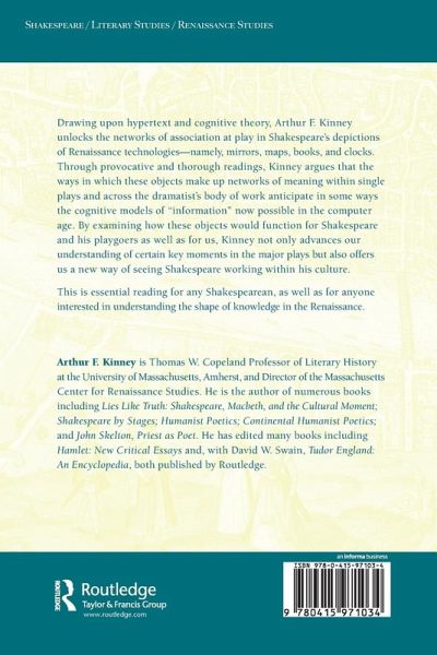 In this book, renowned Renaissance drama critic Arthur F. Kinney argues that Shakespeare's method of composing plays through networks of meanings can be seen as a harbinger of today's information technology. Drawing upon hypertext and cognitive theory--areas that have for some time promised to take on more importance in the sphere of Shakespeare Studies--as well as the central metaphor of the Routledge collection The Renaissance Computer, Kinney looks in detail at four objects/images in Shakespeare's plays--mirrors, maps, clocks, and books--and explores the ways in which they make up networks of meaning within single plays and across the dramatist's body of work that anticipate in some ways the networks of meaning or "information" now possible in the computer age.