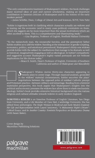 "To the melancholy man, the resourceful heroine, and the peremptory father Kehler enables us to add the widow. Standing at the intersection of gender scripting, economics, politics, and emotional personhood, Shakespeare s thirty-one widows provide Kehler with the subject for meditations that manage to be dramatic as well as historical, imaginatively engaging as well as ideological. In Kehler s sympathetic and suggestive account Shakespeare s highly varied portrayals are not without implications for life choices today." - Bruce R. Smith, Dean s Professor of English, University of Southern California and author of Shakespeare and Masculinity