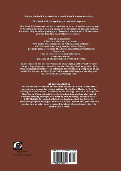 This is the book I wanted and needed when I started teaching. This book will change how you see Shakespeare. This book has been written with teachers in mind. Whether you are new to teaching needing a helping hand, or an experienced teacher looking for something to reinvigorate your classroom practice with Shakespeare, you will find this an invaluable resource. This book contains:four complete units of work. two major assessment tasks with marking criteria. all the worksheets required for the students. program templates using the Australian National Curriculum Outcomes. space for reflection and adaptation. teachers notes. glossary of Shakespearean words and terms. Shakespeare is the most revered and challenging author that we have the privilege to present to our students. The way that we present this titan of English literature can influence our students' perceptions of his works for the rest of their lives. Let's make Shakespeare exciting and fun. Let's shake up Shakespeare.
