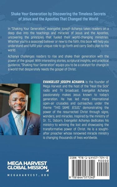 Shake Your Generation by Discovering the Timeless Secrets of Jesus and the Apostles That Changed the World. In "Shaking Your Generation," evangelist Joseph Achanya takes readers on a deep dive into the teachings and miracles of Jesus and the Apostles, uncovering the principles that fueled their world-changing ministries. Whether you're a seasoned believer or new to the faith, this book will help you understand and fulfill your unique role to go forth and carry God's plan to the world. Achanya challenges readers to rise and shake their generation with the power of the gospel. With interesting stories, scriptural insights, and practical guidance, "Shaking Your Generation" equips you to be a catalyst for change in a world that desperately needs the gospel of Christ. Evangelist Joseph Achanya is the founder of Mega Harvest and the host of the "Heal the Sick" radio and TV broadcast. Evangelist Achanya passionately makes Jesus known to today's generation. He has led many international open-air crusades and outreaches under the theme "THIS SAME JESUS," demonstrating the power of the resurrected Christ through signs, wonders, and miracles. Inspired by the ministry of Dr. T.L. Osborn, Evangelist Achanya dedicates his ministry to winning the lost and showcasing the transformative power of Christ. He is a sought-after preacher whose renowned miracle ministry is changing thousands of lives worldwide.