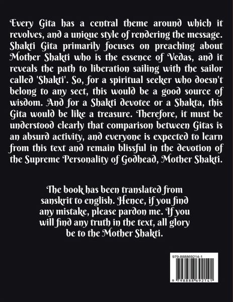 Every Gita has a central theme around which it revolves, and a unique style of rendering the message. Shakti Gita primarily focuses on preaching about Mother Shakti who is the essence of Vedas, and it reveals the path to salvation sailing with the sailor called 'Shakti'. So, for a spiritual seeker who doesn't belong to any sect, this would be a good source of wisdom. And for a Shakti devotee or a Shakta, this Gita would be like a treasure. Therefore, it must be understood clearly that comparison between Gitas is an absurd activity, and everyone is expected to learn from this text and remain blissful in the devotion of the Supreme Personality of Godhead, Mother Shakti.