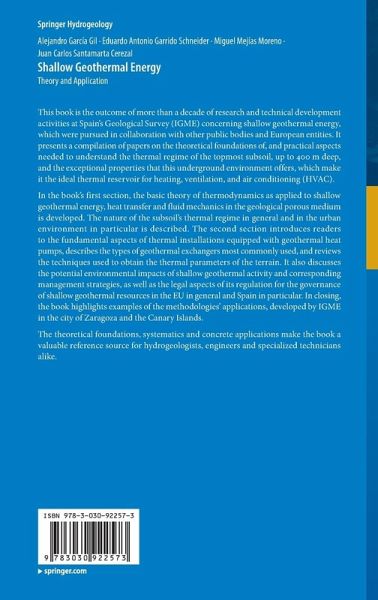 In the book's first section, the basic theory of thermodynamics as applied to shallow geothermal energy, heat transfer and fluid mechanics in the geological porous medium is developed. The nature of the subsoil's thermal regime in general and in the urban environment in particular is described. The second section introduces readers to the fundamental aspects of thermal installationsequipped with geothermal heat pumps, describes the types of geothermal exchangers most commonly used, and reviews the techniques used to obtain the thermal parameters of the terrain. It also discusses the potential environmental impacts of shallow geothermal activity and corresponding management strategies, as well as the legal aspects of its regulation for the governance of shallow geothermal resources in the EU in general and Spain in particular. In closing, the book highlights examples of the methodologies' applications, developed by IGME in the city of Zaragoza and the Canary Islands.