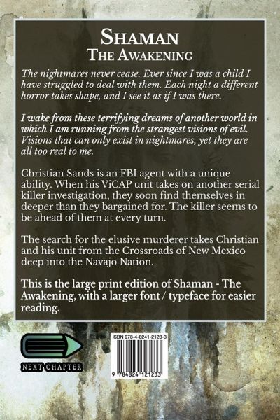 The nightmares never cease. Ever since I was a child I have struggled to deal with them. Each night a different horror takes shape, and I see it as if I was there. I wake from these terrifying dreams of another world in which I am running from the strangest visions of evil. Visions that can only exist in nightmares, yet they are all too real to me. Christian Sands is an FBI agent with a unique ability. When his ViCAP unit takes on another serial killer investigation, they soon find themselves in deeper than they bargained for. The killer seems to be ahead of them at every turn. The search for the elusive murderer takes Christian and his unit from the Crossroads of New Mexico deep into the Navajo Nation. This is the large print edition of Shaman - The Awakening, with a larger font / typeface for easier reading.