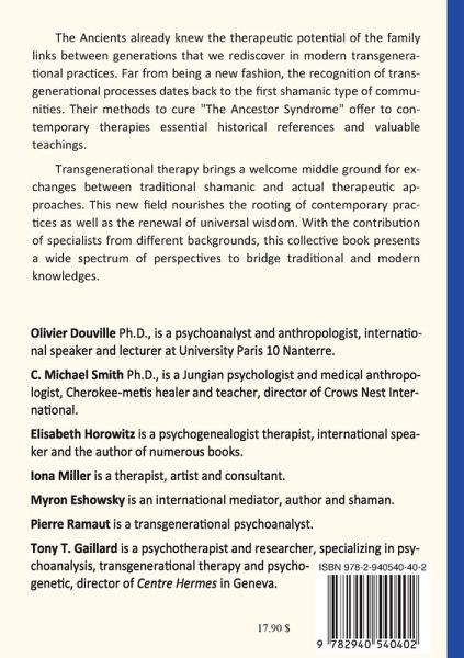 The Ancients already knew the therapeutic potential of the family links between generations that we rediscover in modern transgenerational practices. Far from being a new fashion, the recognition of transgenerational processes dates back to the first shamanic type of communities. Their methods to cure "The Ancestor Syndrome" offer to contemporary therapies essential historical references and valuable teachings. Transgenerational therapy brings a welcome middle ground for exchanges between traditional shamanic and actual therapeutic approaches. This new field nourishes the rooting of contemporary practices as well as the renewal of universal wisdom. With the contribution of specialists from different backgrounds, this collective book presents a wide spectrum of perspectives to bridge traditional and modern knowledges. Olivier Douville Ph.D., is a psychoanalyst and anthropologist, international speaker and lecturer at University Paris 10 Nanterre. C. Michael Smith Ph.D., is a Jungian psychologist and medical anthropologist, Cherokee-metis healer and teacher, director of Crows Nest International. Elisabeth Horowitz is a psychogenealogist therapist, international speaker and the author of numerous books. Iona Miller is a therapist, artist and consultant. Myron Eshowsky is an international mediator, author and shaman. Pierre Ramaut is a transgenerational psychoanalyst. Tony T. Gaillard is a psychotherapist and researcher, specializing in psychoanalysis, transgenerational therapy and psychogenetic, director of Centre Hermes in Geneva.