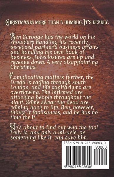 Christmas is more than a humbug. It's deadly. Ben Scrooge has the world on his shoulders handling his recently deceased partner's business affairs and handling his own book of business. Foreclosures are up and revenue down. A very disappointing Christmas. Complicating matters further, the Dread is raging through south London, and the sanitariums are overflowing. The infirmed are attacking people throughout the night. Some swear the dead are coming back to life. Ben, however, thinks it foolishness, and he has no time for it. He's about to find out who the fool truly is, and only a miracle, or something like it, can save him.