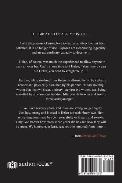 THE GREATEST OF ALL IMPOSTORS... ...Once the purpose of using love to realize an objective has been satisfied, it is no longer of use. Exposed are a conniving ingenuity and an extraordinary capacity to deceive... ...Helen, of course, was much too experienced to allow anyone to walk all over her. Cathy at one time told Helen, "Your ninety years old Helen, you need to straighten up..." ...Further, while stealing from Helen he allowed her to be verbally abused and physically assaulted by his partner. He saw nothing wrong that his own sister, a ninety one year old widow, was being assaulted by a person one hundred fifty pounds heavier and twenty three years younger... ... We have seventy years, and if we are strong we get eighty. Just how strong and blessed is Helen to reach ninety two. Her remaining years may be spent peacefully or in pain and sorrow. Only God knows how many more years she has and how they will be spent. We hope she, at least, reaches one hundred if not more... ----from Shame and Virtue