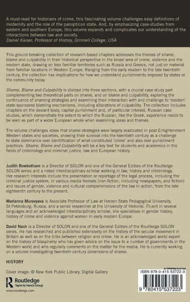 This volume brings together a range of work by leading writers in the field and engages with the comparative dimensions of shame, blame, and culpability and their fundamentally important impact upon modern multicultural states. Tracing use, abuse, and negotiation between the 17th and 20th centuries in a number of different geographical locations, this book forms a part of the movement within criminal and legal history to turn the focus away from capital and serious crime to look at the impact of lesser (and more common) criminality which has a daily impact on people's lives. In studying the interaction of how people understand the boundaries of acceptable behaviour, the volume illustrates perceptions of crime and morality at work in previously unstudied societies at different historical junctures.