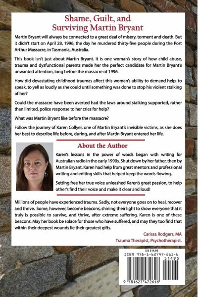 Martin Bryant will always be connected to a great deal of misery, torment and death. But it didn’t start on April 28, 1996, the day he murdered thirty-five people in what became known as the Port Arthur Massacre, in Tasmania, Australia. This book isn’t just about Martin Bryant. It is one woman’s story of how child abuse, trauma and dysfunctional parents made her the perfect candidate for Martin Bryant’s unwanted attention, long before the massacre of 1996. Just how did the devastating childhood traumas affect this woman’s ability to demand help, to speak, to yell as loudly as she could until something was done to stop his violent stalking of her? Could the massacre have been averted had the laws around stalking supported, rather than limited, police response to her cries for help? What was Martin Bryant like before the massacre? Follow the journey of one of Martin Bryant’s invisible victims, as she does her best to describe life before, during and after Martin Bryant entered her life.