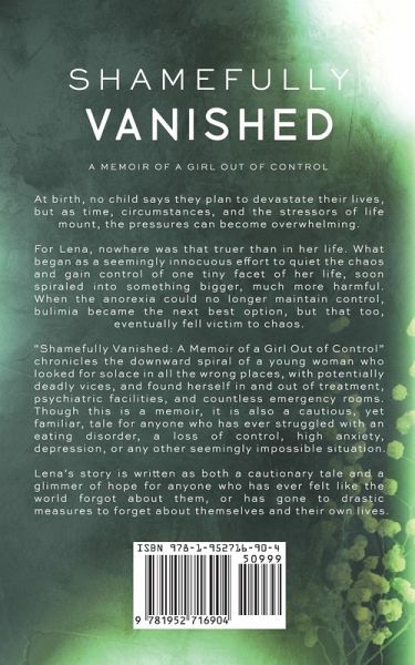 At birth, no child says they plan to devastate their lives, but as time, circumstances, and the stressors of life mount, the pressures can become overwhelming. For Lena, nowhere was that truer than in her life. What began as a seemingly innocuous effort to quiet the chaos and gain control of one tiny facet of her life, soon spiraled into something bigger, much more harmful. When the anorexia could no longer maintain control, bulimia became the next best option, but that too, eventually fell victim to chaos. "Shamefully Vanished: A Memoir of a Girl Out of Control" chronicles the downward spiral of a young woman who looked for solace in all the wrong places, with potentially deadly vices, and found herself in and out of treatment, psychiatric facilities, and countless emergency rooms. Though this is a memoir, it is also a cautious, yet familiar, tale for anyone who has ever struggled with an eating disorder, a loss of control, high anxiety, depression, or any other seemingly impossible situation. Lena's story is written as both a cautionary tale and a glimmer of hope for anyone who has ever felt like the world forgot about them, or has gone to drastic measures to forget about themselves and their own lives.