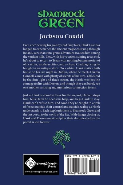 Ever since hearing his granny's old fairy tales, Hank Lear has longed to experience the ancient magic coursing through Ireland, sure that some grand adventure awaited him among the verdant hills. Now, with his vacation coming to an end, he's about to return to Texas with nothing but memories of old castles, modern cities, and a cheap Claddagh ring he bought in an antique store. On a whim, Hank visits a bath house on his last night in Dublin, where he meets Darren Connell, a man with plenty of secrets of his own. Obscured by the dim light and thick steam, shy Hank musters the courage to flirt with Darren, and though they can barely see one another, a strong and mysterious connection forms. Just as Hank is about to leave for the airport, Darren stops him, tells Hank he needs his help, and begs Hank to stay. Hank can't refuse him, and soon they're caught in a web of forces outside their control and outside reality as Hank understands it. Each step leads them to Shamrock Green and the last portal to the world of the Fae. With danger closing in, Hank and Darren must decipher their destinies before the portal is lost forever.