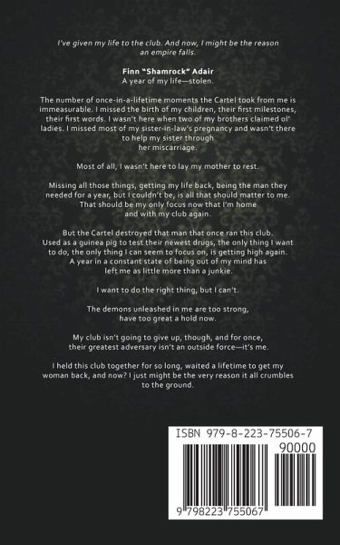 I've given my life to the club. And now, I might be the reason an empire falls. Finn "Shamrock" Adair A year of my life—stolen. The number of once-in-a-lifetime moments the Cartel took from me is immeasurable. I missed the birth of my children, their first milestones, their first words. I wasn't here when two of my brothers claimed ol' ladies. I missed most of my sister-in-law's pregnancy and wasn't there to help my sister through her miscarriage. Most of all, I wasn't here to lay my mother to rest. Missing all those things, getting my life back, being the man they needed for a year, but I couldn't be, is all that should matter to me. That should be my only focus now that I'm home and with my club again. But the Cartel destroyed that man that once ran this club. Used as a guinea pig to test their newest drugs, the only thing I want to do, the only thing I can seem to focus on, is getting high again. A year in a constant state of being out of my mind has left me as little more than a junkie. I want to do the right thing, but I can't. The demons unleashed in me are too strong, have too great a hold now. My club isn't going to give up, though, and for once, their greatest adversary isn't an outside force—it's me. I held this club together for so long, waited a lifetime to get my woman back, and now? I just might be the very reason it all crumbles to the ground.