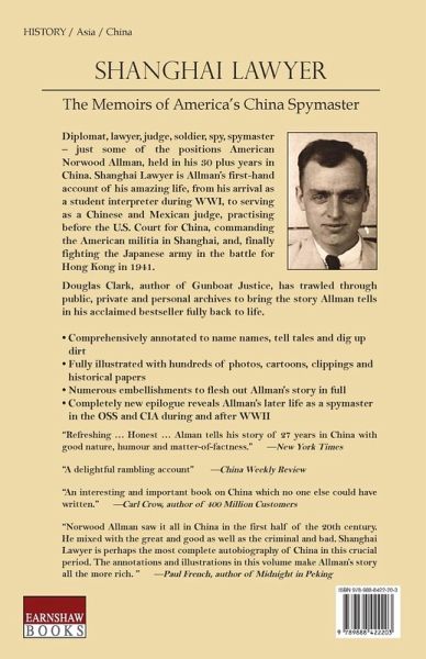 Diplomat, lawyer, judge, soldier, spy, spymaster - just some of the positions American Norwood Allman, held in his 30 plus years in China. Shanghai Lawyer is Allman's first-hand account of his amazing life, from his arrival as a student interpreter during WWI, to serving as a Chinese and Mexican judge, practising before the U.S. Court for China, commanding the American militia in Shanghai, and, finally fighting the Japanese army in the battle for Hong Kong in 1941.