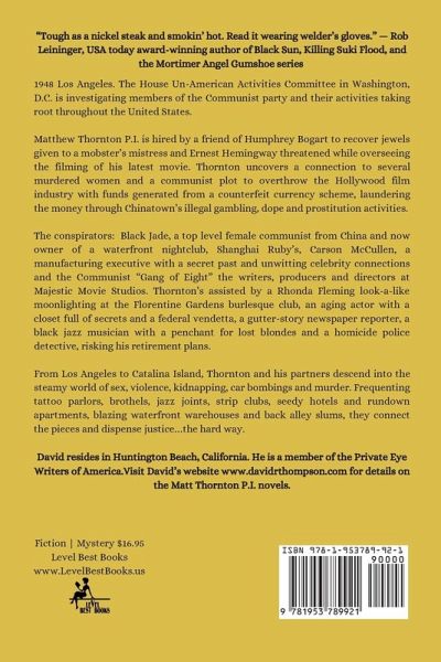 1948 Los Angeles. The House Un-American Activities Committee in Washington, D.C. is investigating members of the Communist party and their activities taking root throughout the United States. Matthew Thornton P.I. is hired by a friend of Humphrey Bogart to recover jewels given to a mobster's mistress and Ernest Hemingway threatened while overseeing the filming of his latest movie. Thornton uncovers a connection to several murdered women and a communist plot to overthrow the Hollywood film industry with funds generated from a counterfeit currency scheme, laundering the money through Chinatown's illegal gambling, dope and prostitution activities. The conspirators: Black Jade, a top level female communist from China and now owner of a waterfront nightclub, Shanghai Ruby's, Carson McCullen, a manufacturing executive with a secret past and unwitting celebrity connections and the Communist "Gang of Eight" the writers, producers and directors at Majestic Movie Studios. Thornton's assisted by a Rhonda Fleming look-a-like moonlighting at the Florentine Gardens burlesque club, an aging actor with a closet full of secrets and a federal vendetta, a gutter-story newspaper reporter, a black jazz musician with a penchant for lost blondes and a homicide police detective, risking his retirement plans. From Los Angeles to Catalina Island, Thornton and his partners descend into the steamy world of sex, violence, kidnapping, car bombings and murder. Frequenting tattoo parlors, brothels, jazz joints, strip clubs, seedy hotels and rundown apartments, blazing waterfront warehouses and back alley slums, they connect the pieces and dispense justice...the hard way.