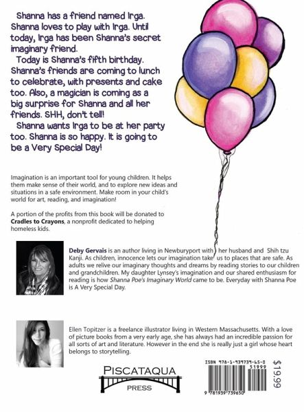 Shanna has a friend named Irga. Shanna loves to play with Irga. Until today, Irga has been Shanna's secret imaginary friend. Today is Shanna's fifth birthday. Shanna's friends are coming to lunch to celebrate, with presents and cake too. Also, a magician is coming as a big surprise for Shanna and all her friends. SHH, don't tell! Shanna wants Irga to be at her party too. Shanna is so happy. It is going to be a Very Special Day! Deby Gervais is an author living in Newburyport with her husband and Shih tzu Kanji. As children, innocence lets our imagination take us to places that are safe. As adults we relive our imaginary thoughts and dreams by reading stories to our children and grandchildren. My daughter Lynsey's imagination and our shared enthusiasm for reading is how Shanna Poe's Imaginary World came to be. Everyday with Shanna Poe is A Very Special Day. Ellen Topoitzer is a freelance illustrator living in Western Massachusetts. With a love of picture books from a very early age, she has always had an incredible passion for all sorts of art and literature. However in the end she is really just a girl whose heart belongs to storytelling.