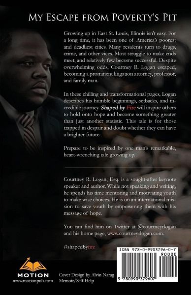 Growing up in East St. Louis, Illinois isn't easy. For a long time, it has been one of America's poorest and deadliest cities. Many residents turn to drugs, crime, and other vices. Most struggle to make ends meet, and relatively few become successful. Despite overwhelming odds, Courtney R. Logan escaped, becoming a prominent litigation attorney, professor, and family man. In these chilling and transformational pages, Logan describes his humble beginnings, setbacks, and incredible journey. Shaped by Fire will inspire others to hold onto hope and become something greater than just another statistic. This tale is for those trapped in despair and doubt whether they can have a brighter future. Prepare to be inspired by one man's remarkable, heart-wrenching tale growing up. Courtney R. Logan, Esq. is a sought-after keynote speaker and author. While not speaking and writing, he spends his time mentoring and motivating youth to make wise choices. He is on an international mission to save youth by empowering them with his message of hope. You can find him on Twitter at @courtneyrlogan and his home page is www.courtneyrlogan.com.