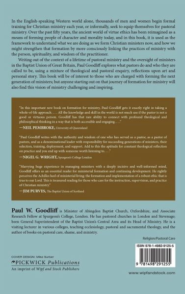 In the English-speaking Western world alone, thousands of men and women begin formal training for Christian ministry each year, or informally, seek to equip themselves for pastoral ministry. Over the past fifty years, the ancient world of virtue ethics has been reimagined as a means of forming people of character and morality today, and in this book, it is used as the framework to understand what we are doing as we form Christian ministers now, and how we might strengthen that formation by more consciously linking the practices of ministry with the person, spirituality, and wisdom of the practitioner. Writing out of the context of a lifetime of pastoral ministry and the oversight of ministers in the Baptist Union of Great Britain, Paul Goodliff explores what pastors do and who they are called to be, using a mixture of theological and pastoral inquiry, reflections upon art, and personal story. This book will be of interest to those who are charged with forming the next generation of ministers; but anyone starting out on that journey of formation for ministry will also find this vision of ministry challenging and inspiring. ""In this important new book on formation for ministry, Paul Goodliff gets it exactly right in taking a whole-of-life approach. . . . All the knowledge and skill in the world is not much use if the pastor is not a good or virtuous person. Goodliff has that rare ability to connect with profound theological and philosophical thinking in a way that is both accessible and engaging. . . ."" --Neil Pembroke, University of Queensland ""Paul Goodliff writes with the authority and wisdom of one who has served as a pastor, as a pastor of pastors, and as a denominational leader with responsibility for succeeding generations of ministers, their selection, training, deployment, and support. Add to this the aptitude for constant theological reflection on practice and you end up with someone worth listening to. . . ."" --Nigel G. Wright, Spurgeon's College, London ""Marrying huge experience in managing ministers with a deeply incisive and well-informed mind, Goodliff offers us an essential reader for ministerial formation and continuing development. He rightly perceives the Achilles heel of ministerial living: the formation and implementation of a robust ethic that is true to our Lord. This is treasured reading for those who care for the instruction, supervision, and practice of Christian ministry."" --Jim Purves, The Baptist Union of Scotland Paul Goodliff is Minister of Abingdon Baptist Church, Oxfordshire, and Associate Research Fellow at Spurgeon's College, London. He has pastored churches in London and Stevenage; been General Superintendent of the Baptist Union's Central Area and its Head of Ministry. He is a visiting lecturer in various colleges, teaching ecclesiology, pastoral and sacramental theology, and the author of books on pastoral care, shame, and ministry.