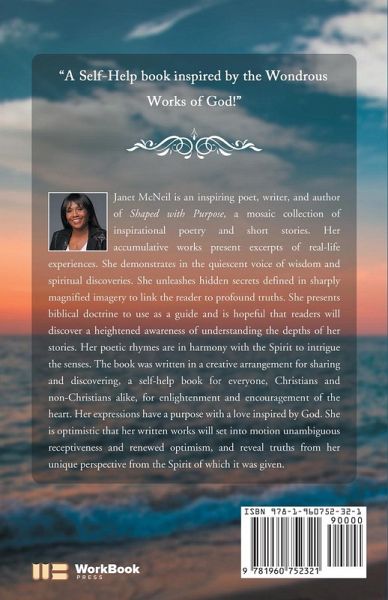 In these accumulative works, she presents excerpts of real-life experiences collectively within a quiescent voice of wisdom that renders spiritual discoveries. She unleashes hidden secrets sharply magnified using defined imagery to link the reader to her profound truths.She presents biblical doctrine as a guide; hopeful the reader will discover a heightened awareness of understanding the depths of each poem and short story. Her poetic rhymes provide a perspective in harmony with the spirit to intrigue the sensesThe book was written in this creative arrangement to share new discoveries. It is a gift to everyone, Christians and non-Christians for enlightenment and encouragement. The expressions have purpose from deep compassionate love inspired by God. She is optimistic her works will set into motion unambiguous receptiveness and renewed optimism, and reveal a unique perspective to illuminate the spirit from which it is given.Janet McNeil is an inspiring poet, writer, and author of "Shaped with Purpose", a mosaic collection of inspirational poetry and short stories.
