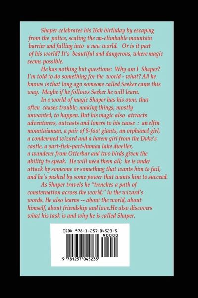 Shaper celebrates his 16th birthday by escaping from the police, climbing the unclimbable mountain barrier and falling into a new world. Or is it really part of his world? It's beautiful and dangerous, where magic seems possible. He has nothing but questions: Why am I Shaper? I'm told to do something for the world - what? All he knows is that long ago someone named Seeker came this way. Maybe if he follows Seeker he will learn. In a world of magic, Shaper has his own, that often causes trouble, making things, mostly unwanted,to happen, but his magic also attracts adventurers, outcasts and loners to his cause. He will need them all; he is under attack by someone or something that wants him to fail, and he's pushed by some power that wants him to succeed. As Shaper travels he learns, about the world, about himself, about friendship and love. He also learns what his task is and why he is called Shaper.
