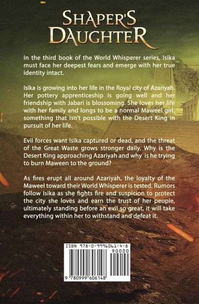 In the third book of the World Whisperer series, Isika must face her deepest fears and emerge with her true identity intact. Isika is growing into her life in the Royal city of Azariyah. Her pottery apprenticeship is going well and her friendship with Jabari is blossoming. She loves her life with her family and longs to be a normal Maweel girl, something that isn't possible with the Desert King in pursuit of her life. Evil forces want Isika captured or dead, and the threat of the Great Waste grows stronger daily. Why is the Desert King approaching Azariyah and why is he trying to burn Maween to the ground? As fires erupt all around Azariyah, the loyalty of the Maweel toward their World Whisperer is tested. Rumors follow Isika as she fights fire and suspicion to protect the city she loves and earn the trust of her people, ultimately standing before an evil so great, it will take everything within her to withstand and defeat it.